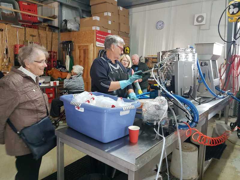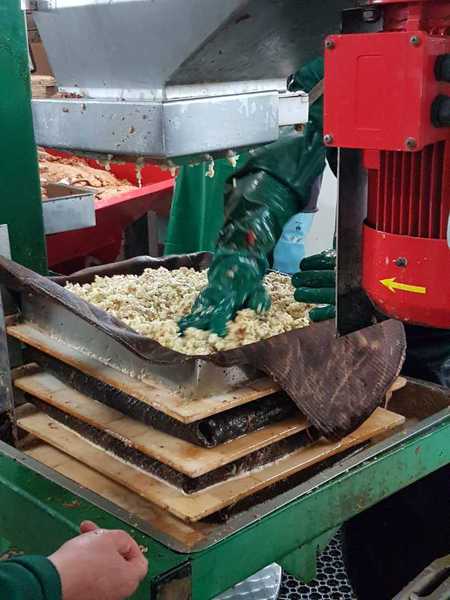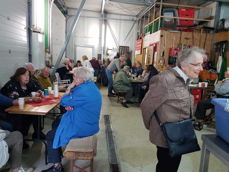 Schon vor dem offiziellen Beginn strömten die Besucher in die Mosterei. Der Sitzplatz wurde knapp und es wurden noch allerlei Tische und Sitzgelegenheiten herbeigeschafft. Der Vorstandsvorsitzende Reinhard Hillnhütter konnte über 40 Besucher begrüßen. Nach dem Kaffeetrinken und Kuchen essen hatten die Besucher die Gelegenheit die Maschinen der Mosterei in Aktion zu sehen und zu erleben, wie der Apfelsaft in die Tüte kommt. Über die Mühle zur Presse. Über den Pasteur, der den Saft auf 80 Grad erhitzt, bis zur Abfüllanlage die den heißen Saft in die 3l Beutel füllt.